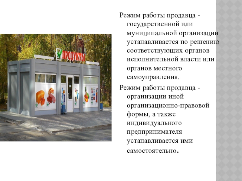 Слайд 5Режим работы продавца - государственной или муниципальной организации устанавливается по решению