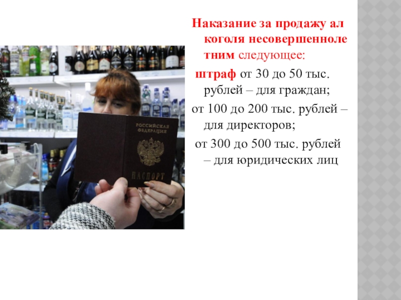 Слайд 27Наказание за продажу алкоголя несовершеннолетним следующее: