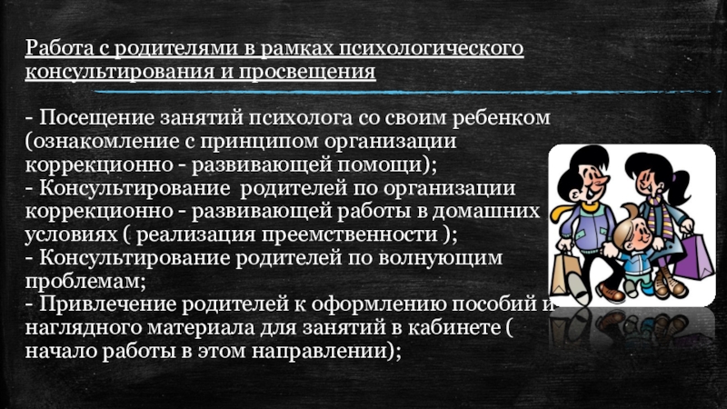 Слайд 13Работа с родителями в рамках психологического консультирования и просвещения
