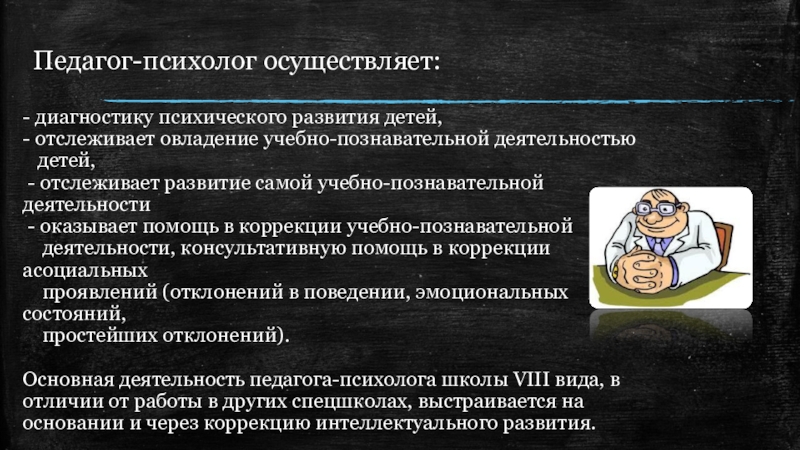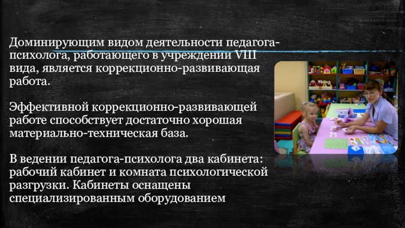 Слайд 19Доминирующим видом деятельности педагога-психолога, работающего в учреждении VIII вида, является коррекционно-развивающая работа.