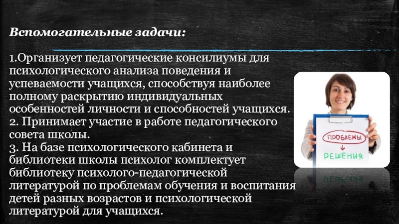 1.Организует педагогические консилиумы для психологического анализа поведения и успеваемости учащихся,