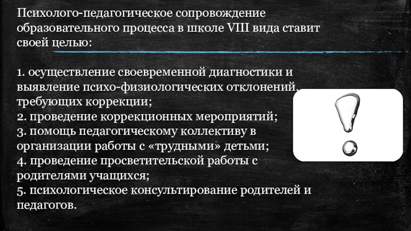 Слайд 5Психолого-педагогическое сопровождение образовательного процесса в школе VIII вида ставит своей целью: