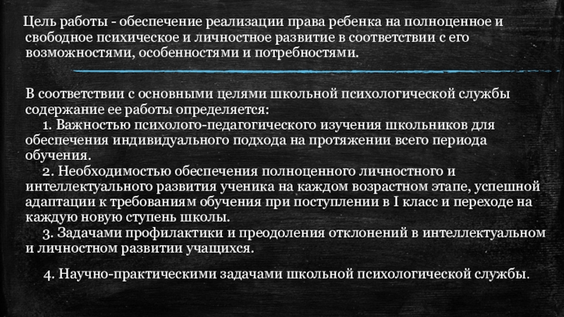 Слайд 4 Цель работы - обеспечение реализации права ребенка на полноценное