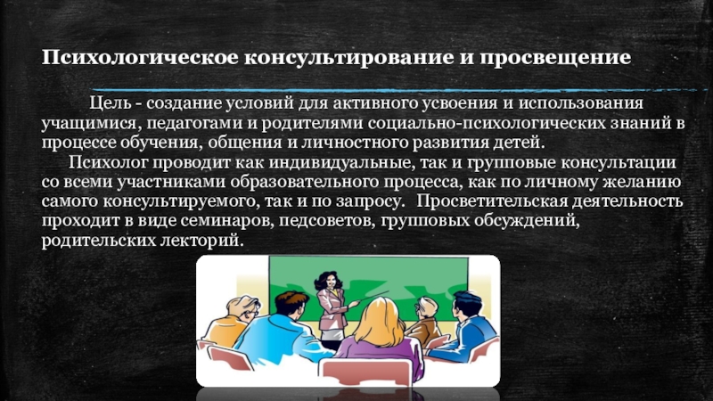 Психолог проводит как индивидуальные, так и групповые консультации со всеми участниками образовательного процесса, как по личному желанию самого консультируемого, так и по запросу. Просветительская деятельность проходит в виде семинаров, педсоветов, групповых обсуждений, родительских лекторий.