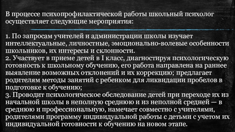 В процессе психопрофилактической работы школьный психолог осуществляет следующие мероприятия: