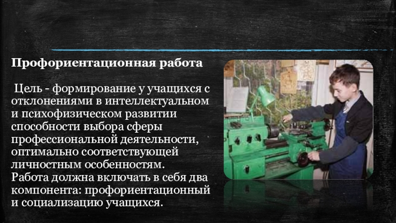 Работа должна включать в себя два компонента: профориентационный и социализацию учащихся.