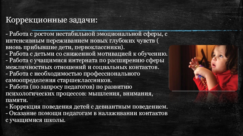 - Работа с ростом нестабильной эмоциональной сферы, с интенсивным переживанием
