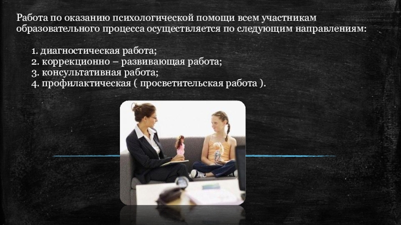 Слайд 6Работа по оказанию психологической помощи всем участникам образовательного процесса осуществляется по