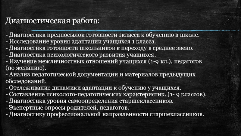 запросам учителей и администрации школы изучает интеллектуальные, личностные, эмоционально-волевые особенности школьников, их интересы и склонности.