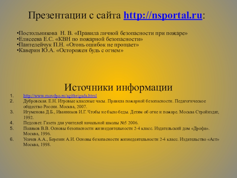 Дубровская. Е.Н. Игровые классные часы. Правила пожарной безопасности. Педагогическое общество России. Москва, 2007.