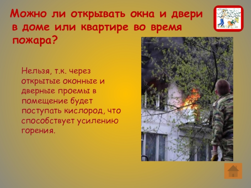 Нельзя, т.к. через открытые оконные и дверные проемы в помещение будет поступать кислород, что способствует усилению горения.