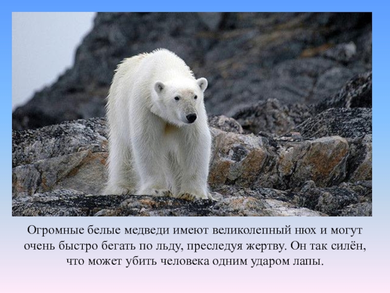 Слайд 7Огромные белые медведи имеют великолепный нюх и могут очень быстро бегать