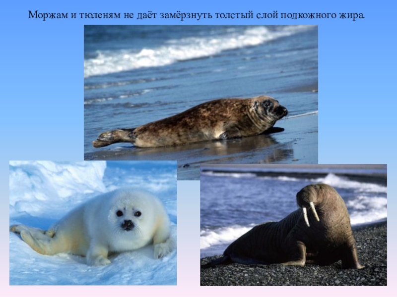 Слайд 8Моржам и тюленям не даёт замёрзнуть толстый слой подкожного жира.