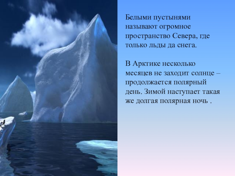 Белыми пустынями называют огромное пространство Севера, где только льды да снега.В Арктике несколько месяцев не заходит солнце