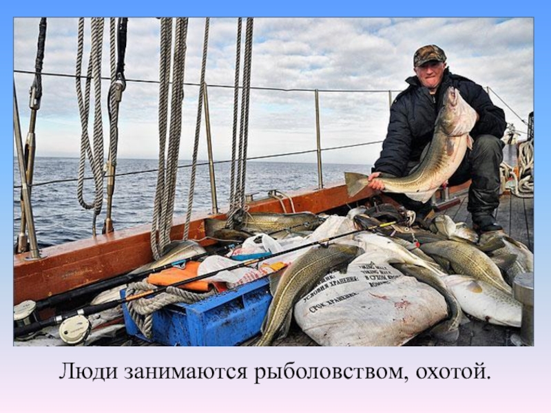 Слайд 13Люди занимаются рыболовством, охотой.