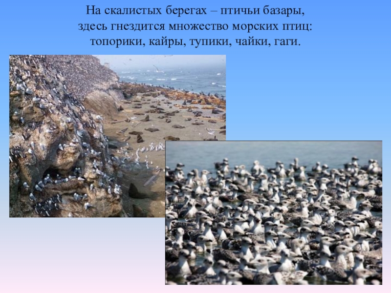 Слайд 9На скалистых берегах – птичьи базары,
