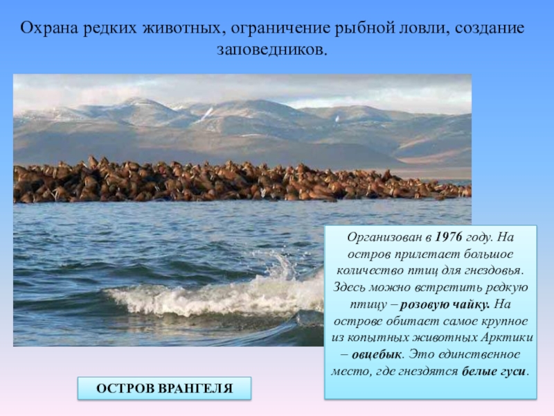 Охрана редких животных, ограничение рыбной ловли, создание заповедников.ОСТРОВ ВРАНГЕЛЯОрганизован в 1976 году. На остров прилетает большое количество