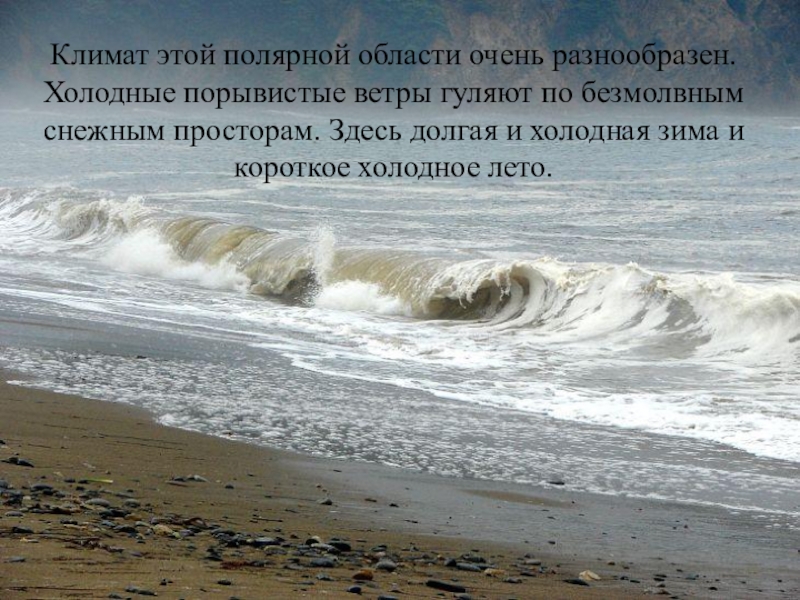 Слайд 3Климат этой полярной области очень разнообразен. Холодные порывистые ветры гуляют по