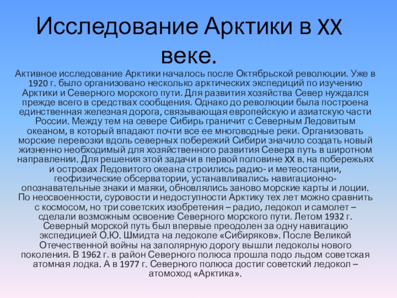 Исследование Арктики в XX веке.Активное исследование Арктики началось после Октябрьской революции. Уже в 1920 г. было организовано