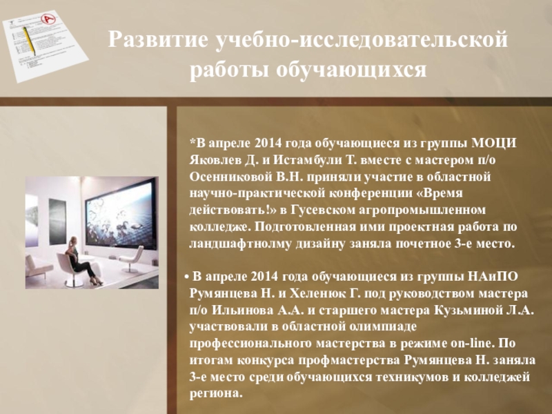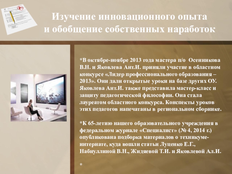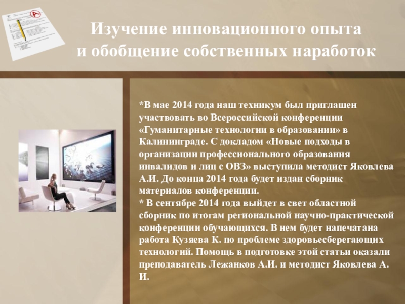 Изучение инновационного опыта и обобщение собственных наработок. Подготовка публикаций педагогов техникума для участия в областных конференциях.