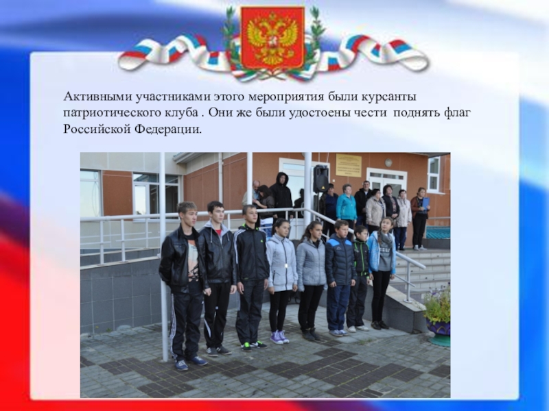 Активными участниками этого мероприятия были курсанты патриотического клуба . Они же были удостоены чести поднять флаг Российской