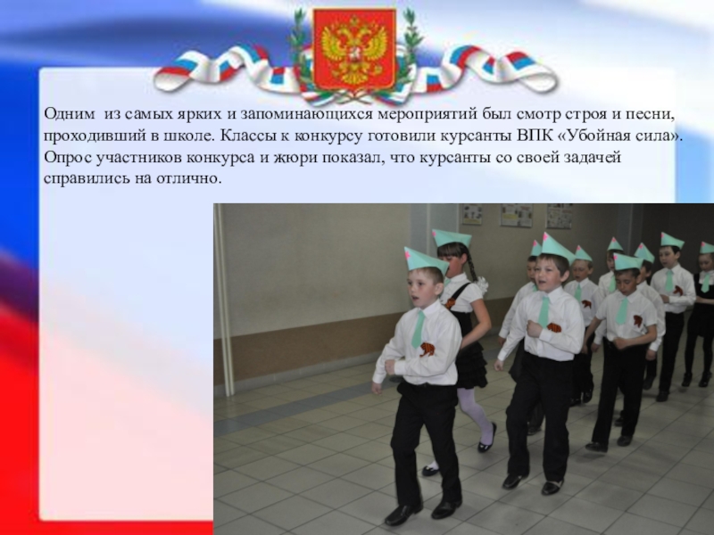 Слайд 4Одним из самых ярких и запоминающихся мероприятий был смотр строя и