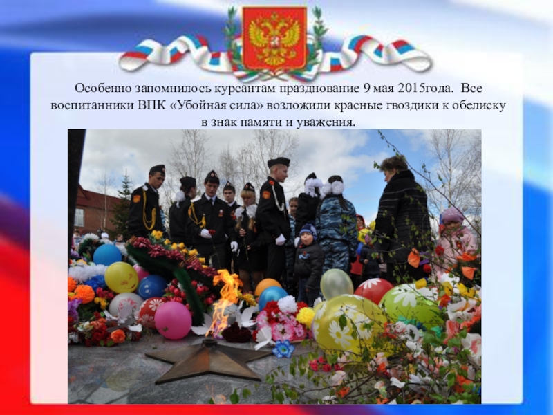Слайд 9Особенно запомнилось курсантам празднование 9 мая 2015года. Все воспитанники ВПК «Убойная