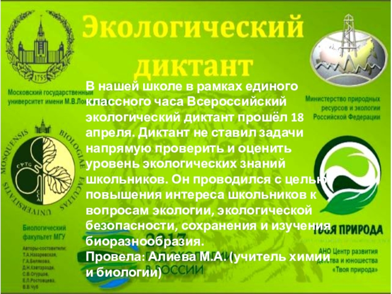 Слайд 6В нашей школе в рамках единого классного часа Всероссийский экологический диктант