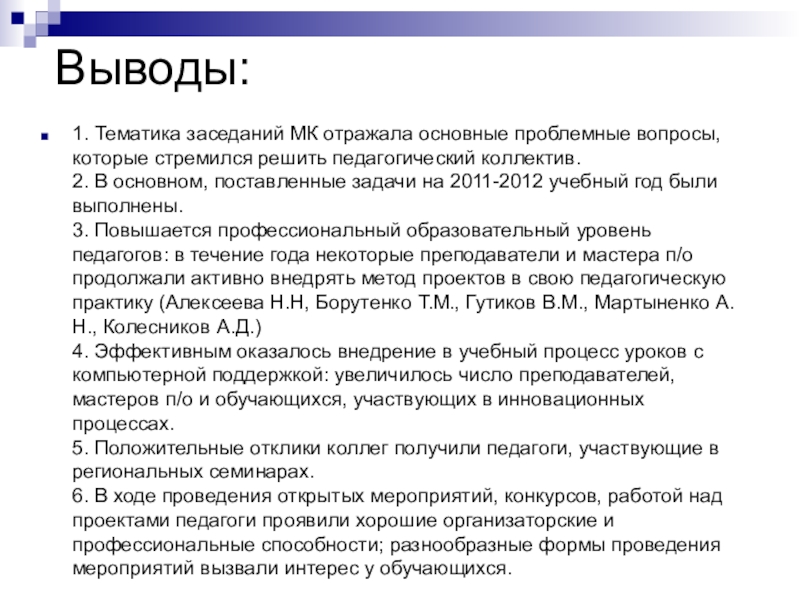 2. В основном, поставленные задачи на 2011-2012 учебный год были выполнены.