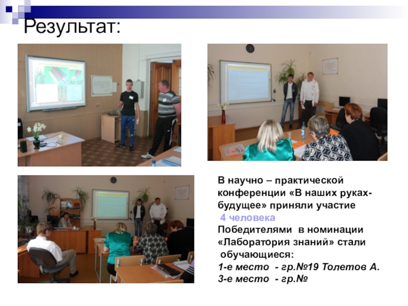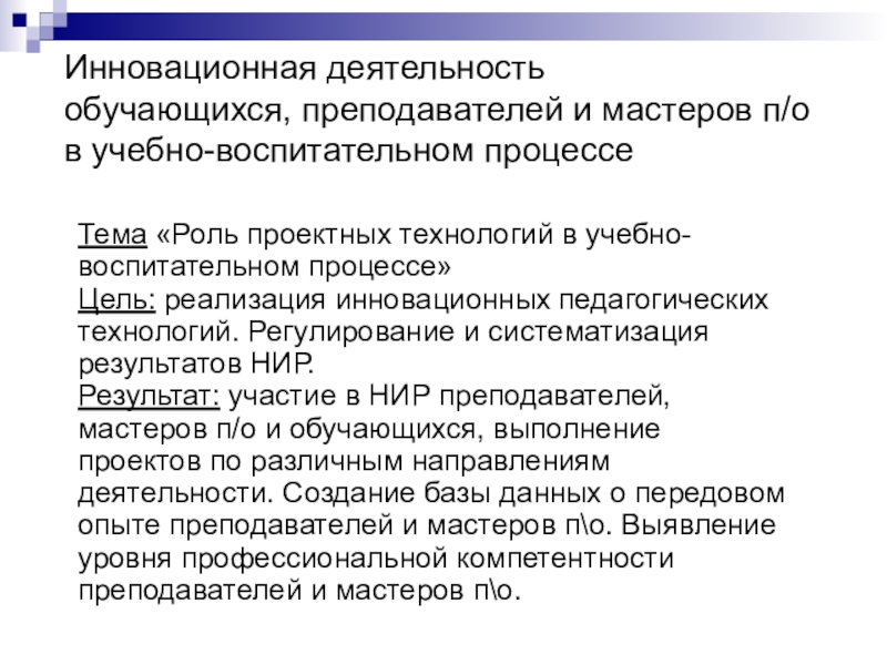 Результат: участие в НИР преподавателей, мастеров п/о и обучающихся, выполнение проектов по различным направлениям деятельности. Создание базы данных о передовом опыте преподавателей и мастеров п\о. Выявление уровня профессиональной компетентности преподавателей и мастеров п\о.