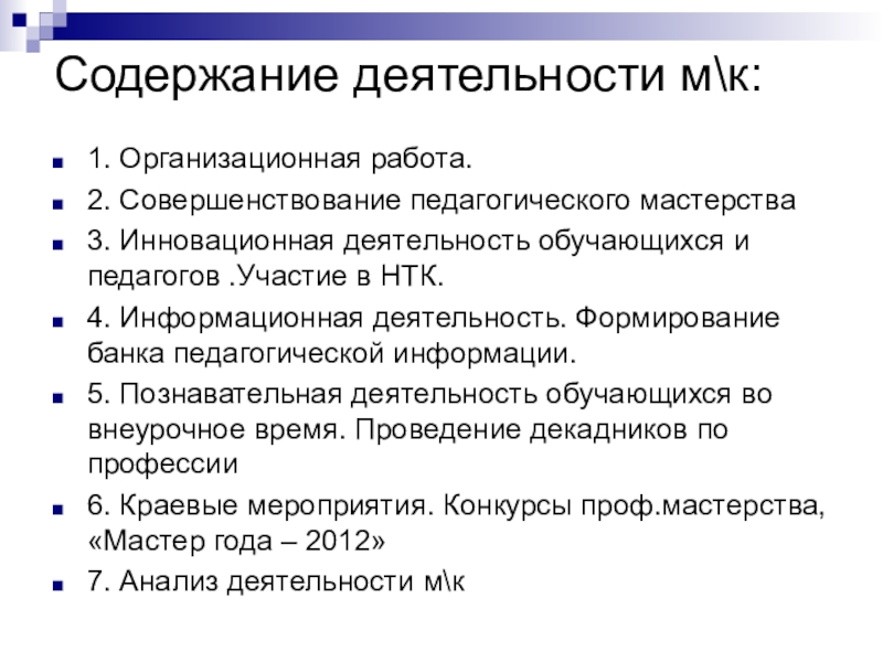 Слайд 11Содержание деятельности м\к: