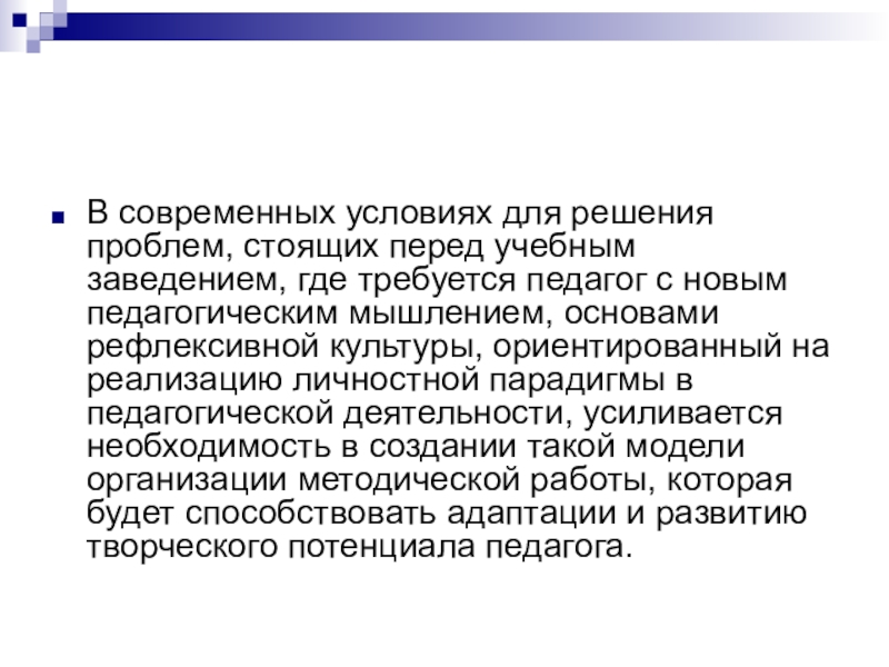 требуется педагог с новым педагогическим мышлением, основами рефлексивной культуры, ориентированный на реализацию личностной парадигмы в педагогической деятельности, усиливается необходимость в создании такой модели организации методической работы, которая будет способствовать адаптации и развитию творческого потенциала педагога.