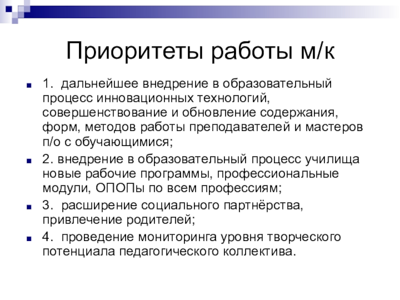 Слайд 5Приоритеты работы м/к