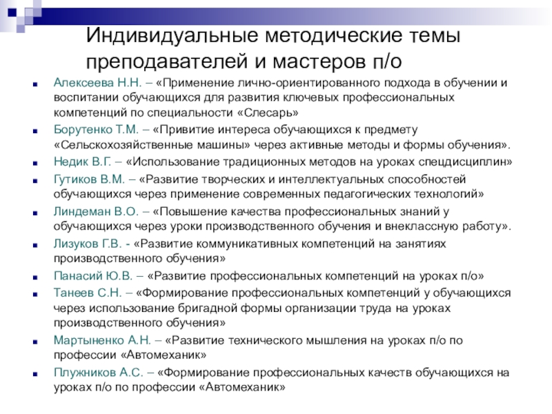 Слайд 8Индивидуальные методические темы преподавателей и мастеров п/о