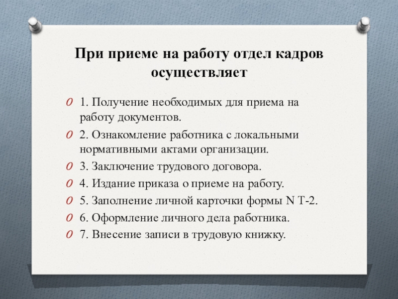 Слайд 7При приеме на работу отдел кадров осуществляет