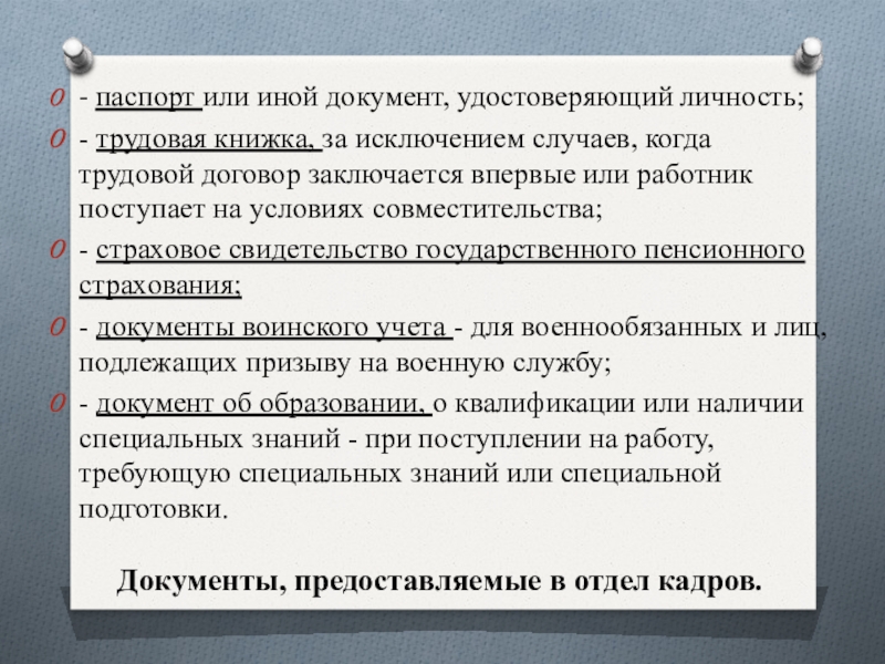 Документы, предоставляемые в отдел кадров.- паспорт или иной документ, удостоверяющий личность;- трудовая книжка, за исключением случаев, когда
