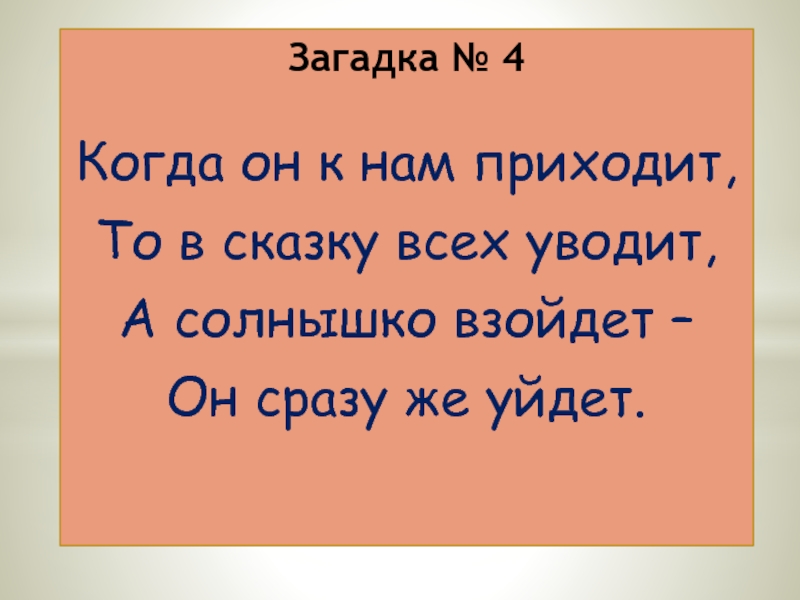 Загадка № 4Когда он к нам приходит,То в сказку всех уводит,А солнышко взойдет – Он сразу же