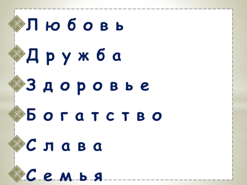 Л ю б о в ьД р у ж б аЗ д о р о в ь еБ о г а т с т в оС л а в аС е м ь яС ч а
