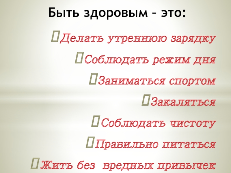 Быть здоровым – это:Делать утреннюю зарядкуСоблюдать режим дняЗаниматься спортомЗакалятьсяСоблюдать чистотуПравильно питатьсяЖить без вредных привычек