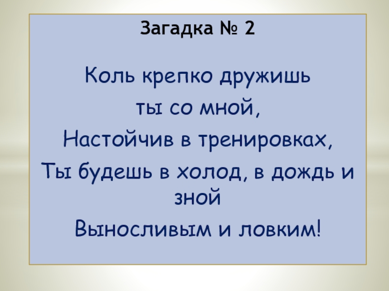 Загадка № 2Коль крепко дружишь ты со мной,Настойчив в тренировках,Ты будешь в холод, в дождь и знойВыносливым