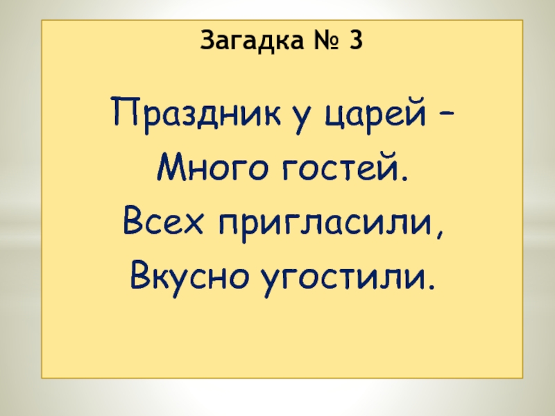 Загадка № 3Праздник у царей – Много гостей.Всех пригласили,Вкусно угостили.