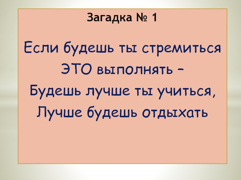 Загадка № 1Если будешь ты стремиться ЭТО выполнять – Будешь лучше ты учиться,Лучше будешь отдыхать