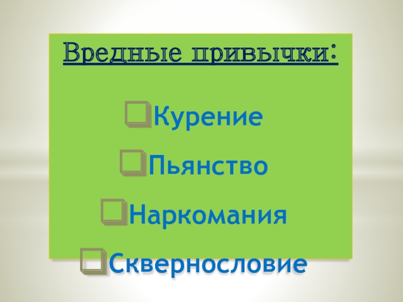 Вредные привычки:КурениеПьянствоНаркоманияСквернословие