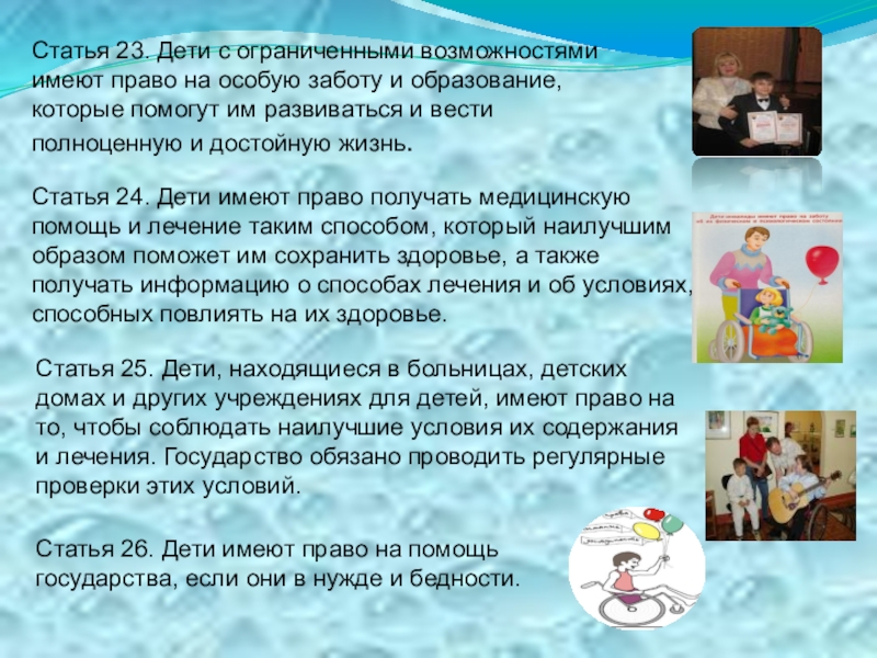 Статья 25. Дети, находящиеся в больницах, детских домах и других учреждениях для детей, имеют право на то, чтобы соблюдать наилучшие условия их содержания и лечения. Государство обязано проводить регулярные проверки этих условий.