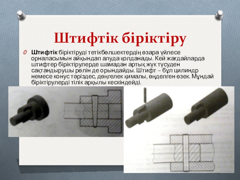 жағдайларда штифтер біріктірулерде шамадан артық жүк түсуден сақтандырушы рөлін де орындайды. Штифт – бұл цилиндр немесе конус тәріздес, дөңгелек қималы, өңделген өзек. Мұндай біріктірулерді тілік арқылы кескіндейді.