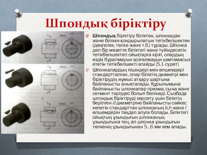 және т.б.) тұрады. Шпонка деп бір мезетте біліктегі және түйіндесетін тетікбөлшектегі ойықтарға кіріп, олардың өздік бұралмауын қозғалмауын қамтамасыз ететін тетікбөлшекті атайды (5.1-сурет)