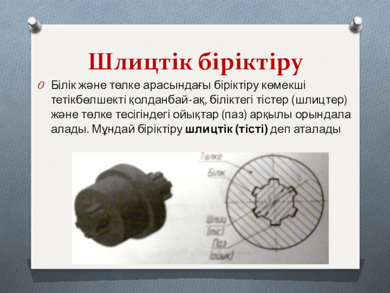 (шлицтер) және төлке тесігіндегі ойықтар (паз) арқылы орындала алады. Мұндай біріктіру шлицтік (тісті) деп аталады