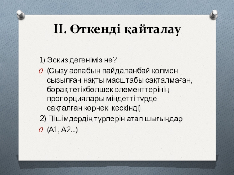 ІІ. Өткенді қайталау 1) Эскиз дегеніміз не? (Сызу аспабын пайдаланбай қолмен сызылған нақты масштабы сақталмаған, бәрақ тетікбөлшек