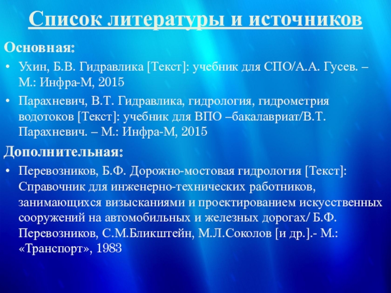 Парахневич, В.Т. Гидравлика, гидрология, гидрометрия водотоков [Текст]: учебник для ВПО –бакалавриат/В.Т.Парахневич. – М.: Инфра-М, 2015