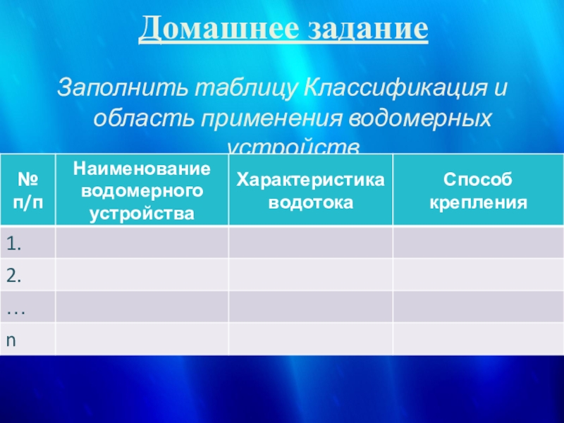 Заполнить таблицу Классификация и область применения водомерных устройств